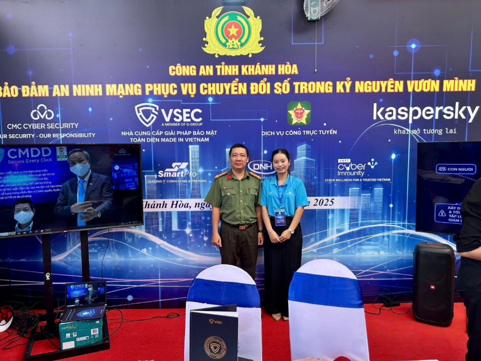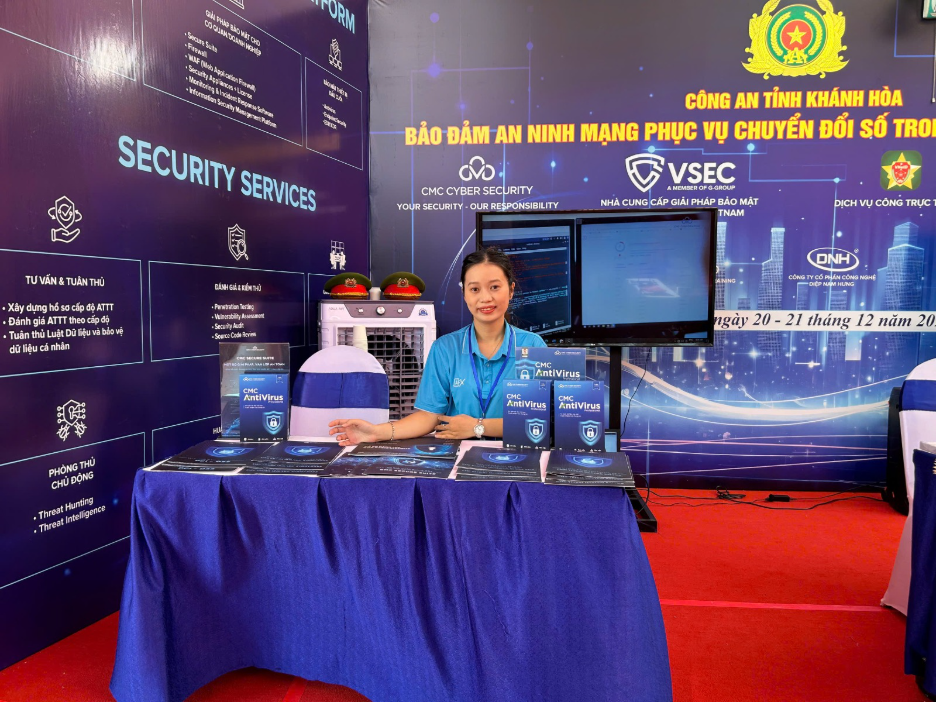 Trong khuôn khổ sự kiện, gian hàng của CMC Cyber Security được bố trí tại gian hàng chung của Công an tỉnh Khánh Hòa, thể hiện sự gắn kết chặt chẽ giữa doanh nghiệp an ninh mạng với lực lượng bảo vệ an ninh, trật tự trong không gian số. Đây cũng là minh chứng rõ nét cho vai trò đồng hành của CMC Cyber Security cùng các cơ quan chức năng và địa phương trong công tác đảm bảo an ninh, an toàn thông tin.